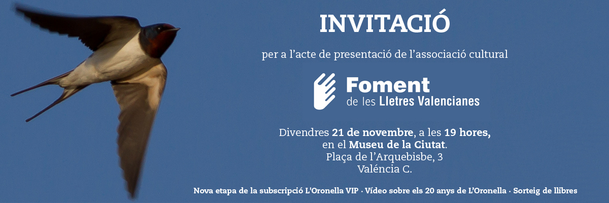 Tenim el plaer d’invitar-vos a la presentació de l’associació cultural Foment de les Lletres Valencianes, una entitat sense ànim de lucre que pren la marca ‘L’Oronella’ per a promoure la llengua i la cultura valencianes, en totes les seues caents. Un nou proyecte, una nova etapa i un nou equip, el guany del qual és, únicament, posar en valor l’identitat colectiva dels valencians.
